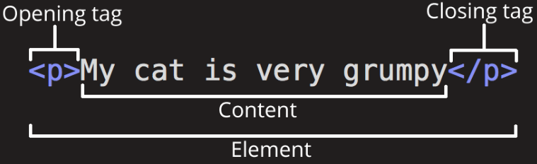- 여는 태그(Opening tag) : <p> (여는 p태그), 요소의 이름으로 구성되고 여닫는 꺽쇠괄호로 감싸짐, 요소가 시작되는 곳을 나타냄